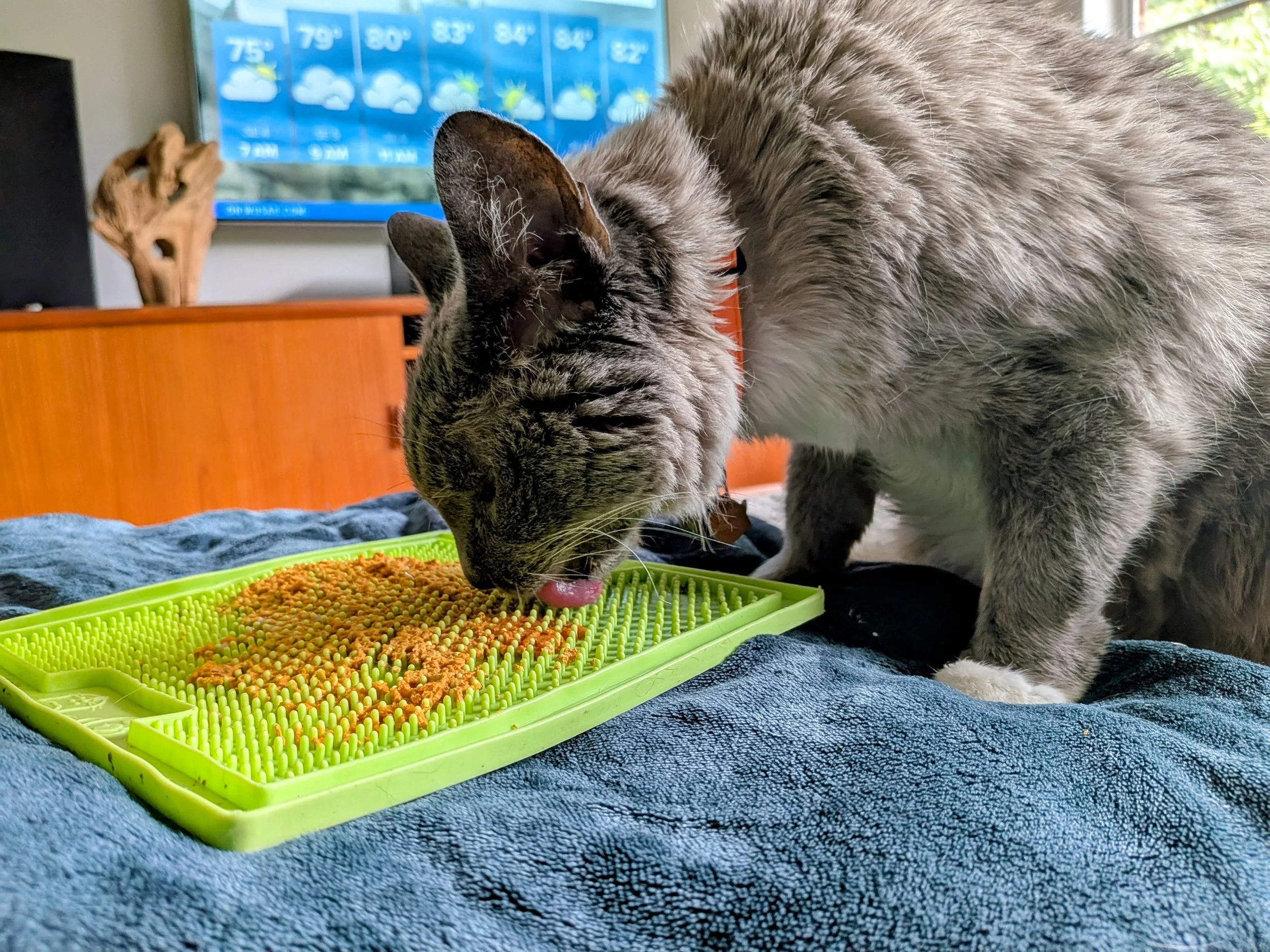 Wet food and Churu paste may be smeared onto a lickimat or into a maze bowl. Think of these food puzzles as your cat’s daily Wordle!